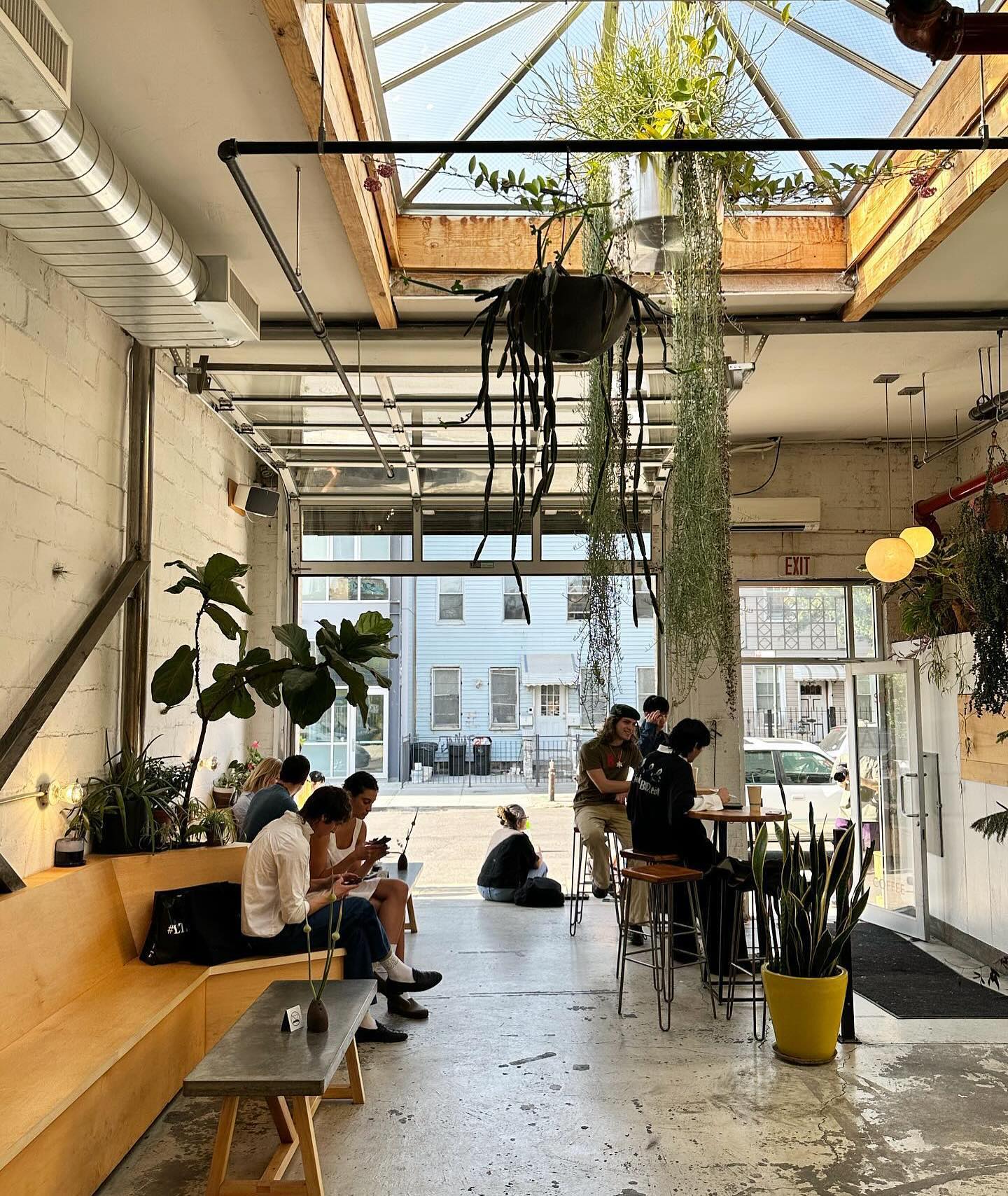 SEY is a contemporary micro roastery and café based in Bushwick. The space is industrial, in what seems to be a garage conversion, but features lots of greenery and three beautiful large skylights that provide lots of warmth. You may recognize their iconic coffee packaging, a sleek white box with colourful inserts sharing all the coffee details. It's a bit of a treck from Manhatten, but that kind of makes us like this place even more. It definitely has a neighbourhood vibe to it, attracting a mix of local residents, creatives, and coffee tourists. When it's nice out, the garage door opens up and the cafe spills onto the side walk where you'll also find lots of beautiful doggos chilling as their owners enjoy their coffee.